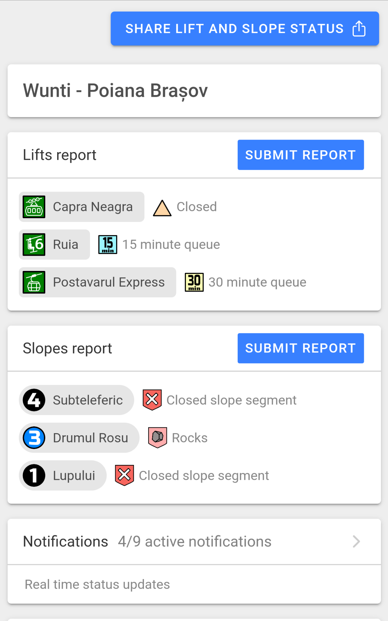 The Wunti app shows you the status of the slopes and lifts in Poiana Brașov. Enable notifications to get real-time updates about lift queues and issues.